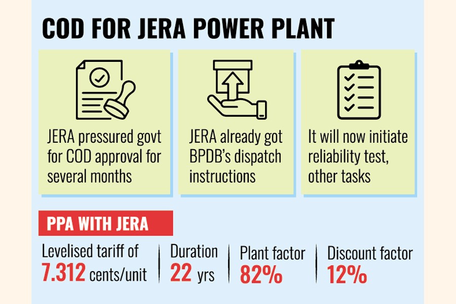 The COD of the plant owned by Japan's Energy for a New Era, mostly known as JERA, is expected this month, a senior BPDB official said.