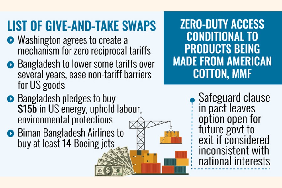 The zero-duty market access is, however, conditional to products being made from imported American cotton and man-made fibres, the interim government's commerce ministry Tuesday explained what comes out of the deal.