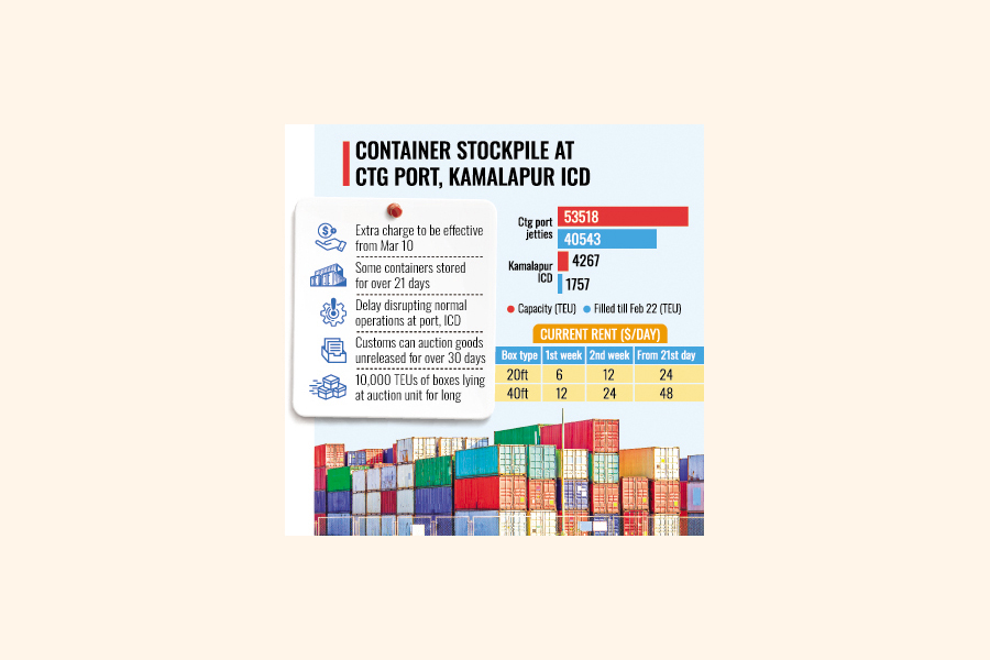 Till Saturday, some 40,543 twenty-foot equivalent units (TEUs) of containers were lying at the port jetties, where the total capacity is 53,518 TEUs. At the Kamalapur ICD, there were around 1,757 TEUs of containers against its total capacity of 4,267 TEUs.