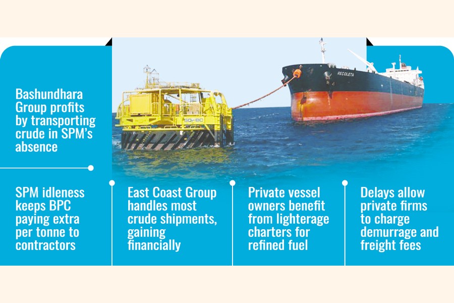The delay in starting operations of the country's maiden single-point mooring (SPM) system -- designed to unload fuel quickly and cheaply -- is allegedly benefiting private operators, who are earning hefty profits at the expense of public money, industry insiders said.