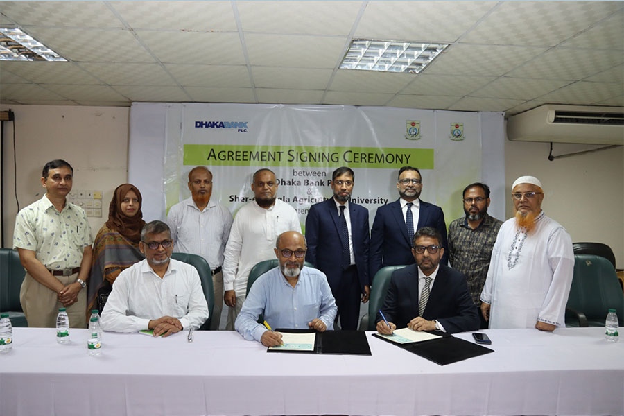 Prof. Dr. Md. Abdul Latif, Vice-Chancellor, Sher-e-Bangla Agricultural University presided over the meeting where the agreement was signed by Mr. Md. Mostaque Ahmed, Deputy Managing Director and Chief Emerging Market Officer, Dhaka Bank and Mr. Sheikh Rezaul Karim, Registrar, Sher-e-Bangla Agricultural University on behalf of their respective institutions on 19 September 2024.