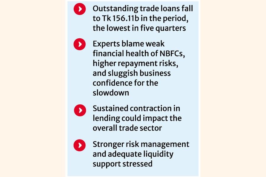 When asked, Dr Masrur Reaz, chairman of Policy Exchange Bangladesh, said the decline in disbursement of trade and commerce loans by NBFCs highlights the cautious approach of lenders amid growing economic uncertainties. The drop in the last quarter coupled with a steady fall in outstanding trade loans and advances indicates that NBFCs are tightening credit in response to repayment risks and market volatility, Dr Reaz said.