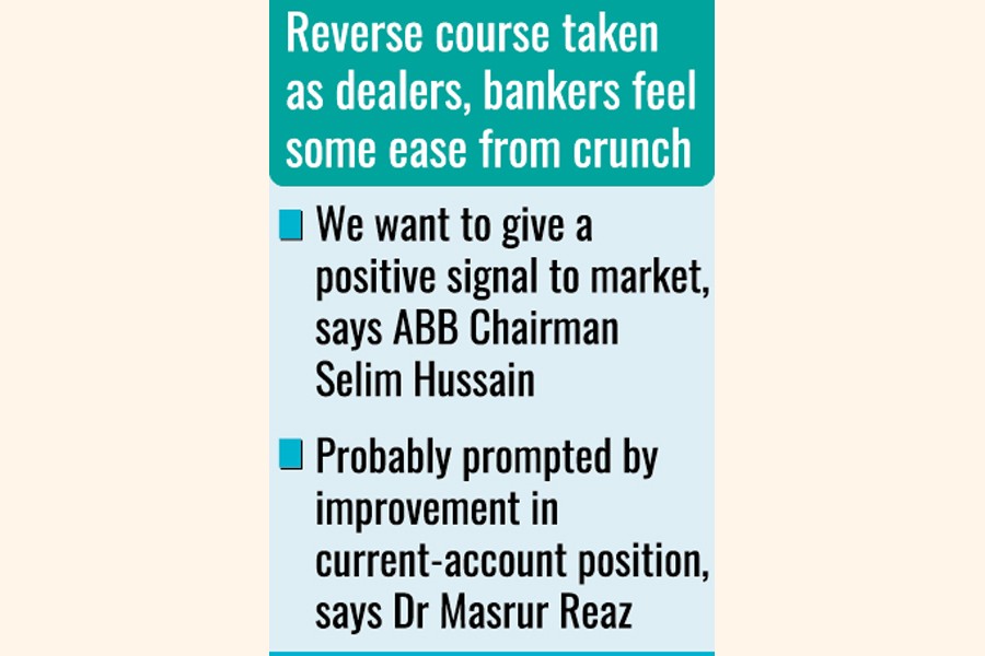 This decision on a reverse course in the taka-dollar exchange comes following a meeting between the Bangladesh Foreign Exchange Dealers' Association (BAFEDA) and the Association of Bankers Bangladesh (ABB) held on Wednesday that did the stocktaking of the country's foreign-exchange situation and overall economic needs of the hour.
