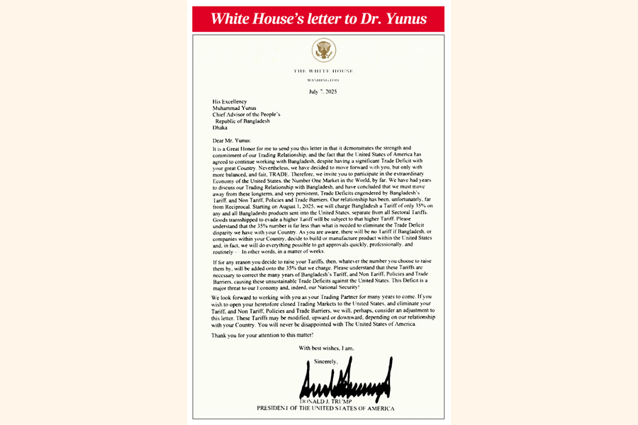 Trump wrote to the interim chief in the letter, dated July 7, "Our relationship has been, unfortunately, far from Reciprocal. Starting on August 1, 2025, we will charge Bangladesh a Tariff of only 35 per cent on any and all Bangladeshi products sent into the United States, separate from all sectoral Tariffs."