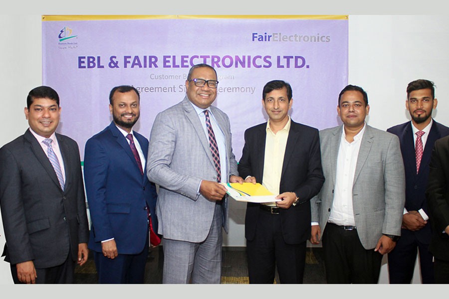 M Khorshed Anowar, Head of Retail and SME Banking of EBL, Md Zahidul Kabir, Head of Treasury and Credit Management and J M Taslim Kabir, Head of Marketing of Fair Electronics Ltd, the authorised national distributor and manufacturer of Samsung products in Bangladesh, signed an agreement in this regard in Dhaka recently, according to a media release.
