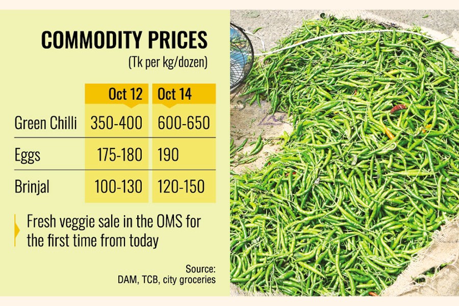 Green chilli price hit Tk600-650 a kg in the city on Monday morning which was Tk350-400 a kg earlier.