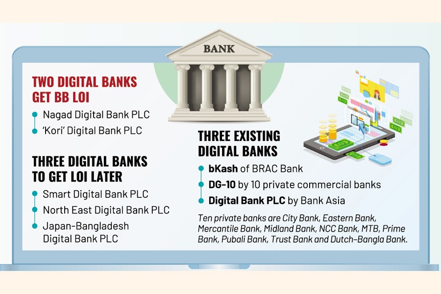 Two of the new digital banks - Nagad Digital Bank PLC and 'Kori' Digital Bank PLC-on the day got letter of intent (LoI). The Bangladesh Bank (BB) will monitor their different indicators over the next six months.