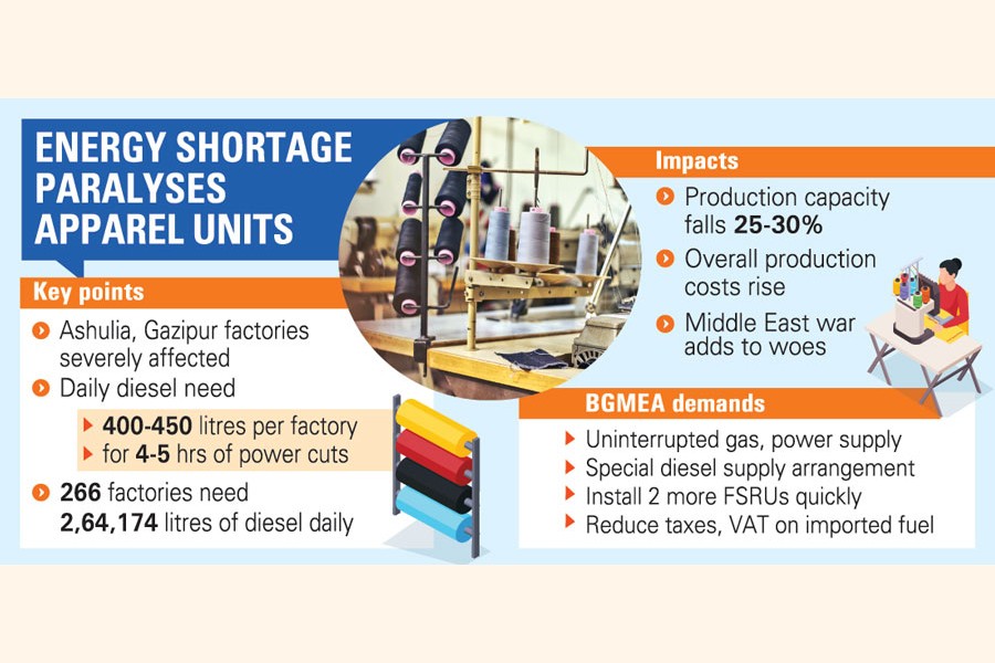The BGMEA said the factories located in the main industrial belts of Ashulia and Gazipur on average need 400-450 litres of diesel to run generators during lead-shedding of up to four hours.