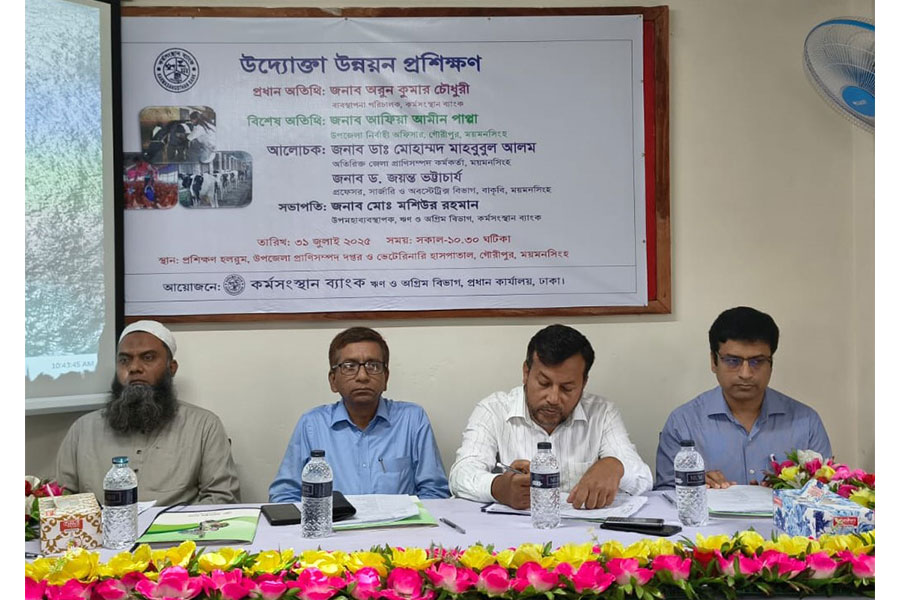 An Entrepreneurship Development Training program, organized by the Loan and Advance Department of Karmasangsthan Bank, was held on Thursday, 31 July 2025, at the Upazila Livestock Office and Veterinary Hospital in Gouripur, Mymensingh.