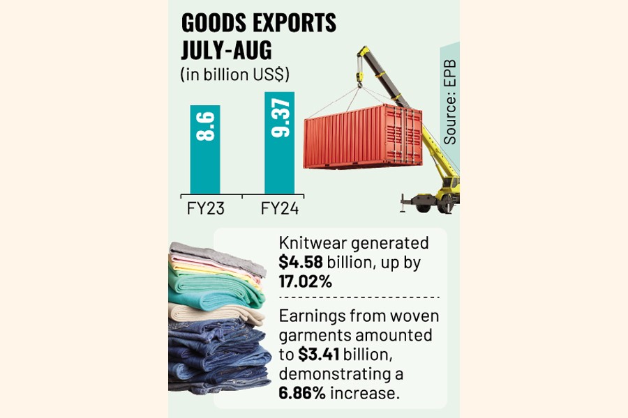 Bangladesh's goods exports fetched $9.37 billion in the first two months of the current fiscal year, according to data released by the Export Promotion Bureau (EPB) Monday, propelled mostly by the apparel-manufacturing might of the country.