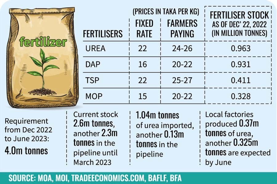 The government rate for urea is Tk 22, Diammonium Phosphate (DAP) Tk 16, Triple Super Phosphate (TSP) Tk 22 and Muriate of Potash (MOP) Tk15.