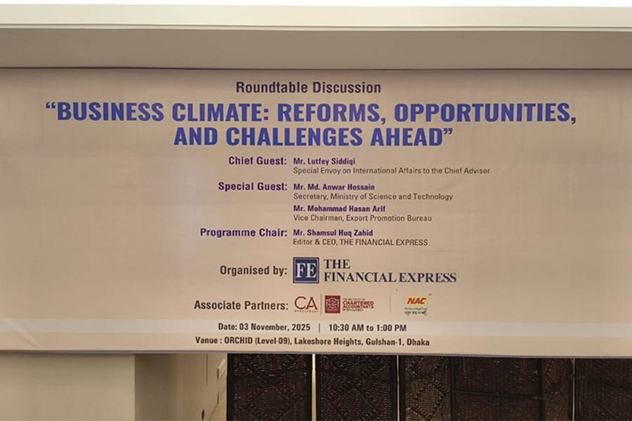 A roundtable discussion titled “Business Climate: Reforms, Opportunities, and Challenges Ahead” — organised by The Financial Express (FE) — is set to begin shortly at Lakeshore Heights in Dhaka.