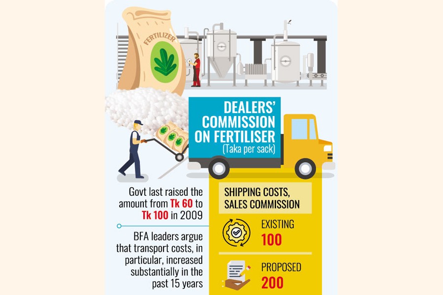 They have demanded enhancements in shipping costs and sales commission to Tk 200 from existing Tk 100 per sack of fertiliser, according to sector insiders.