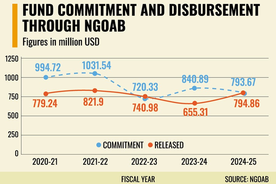 Foreign donors have slightly scaled back their funding commitments for NGOs operating in Bangladesh, even as actual disbursements rose significantly in the last fiscal year amid growing humanitarian needs across the country.