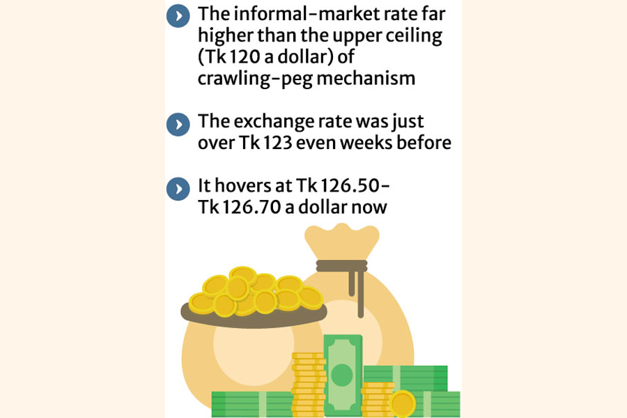 The informal-market rate is far higher than the upper ceiling (Tk 120 a dollar) set in the central bank-introduced crawling-peg mechanism.