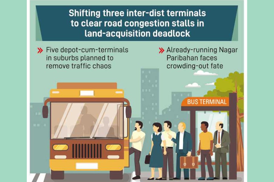 Shifting three crammed inter-district bus terminals from Dhaka city virtually loses gear in land-acquisition hurdles, thus deterring route rationalization and franchise transport service in the capital.