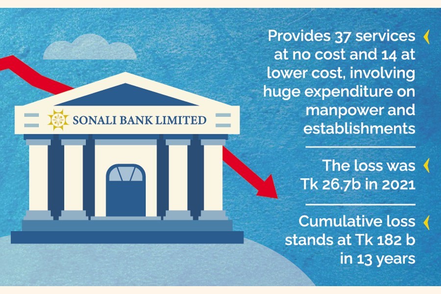 Sonali Bank Ltd incurred a cumulative loss of Tk 182.53 billion in the last 13 years as the state-owned bank has to provide services free of charge or at low cost.