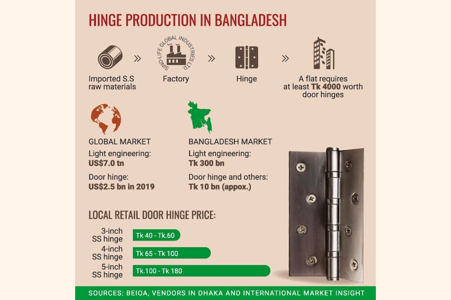 Door hinges, handles, nails and other allied products are key hardware materials for buildings, the market size of which is nearly Tk 10 billion in Bangladesh. A standard-size apartment needs to be fitted with hinges for doors costing at least Tk 4,000, industry people who are familiar with the matter have told the FE.