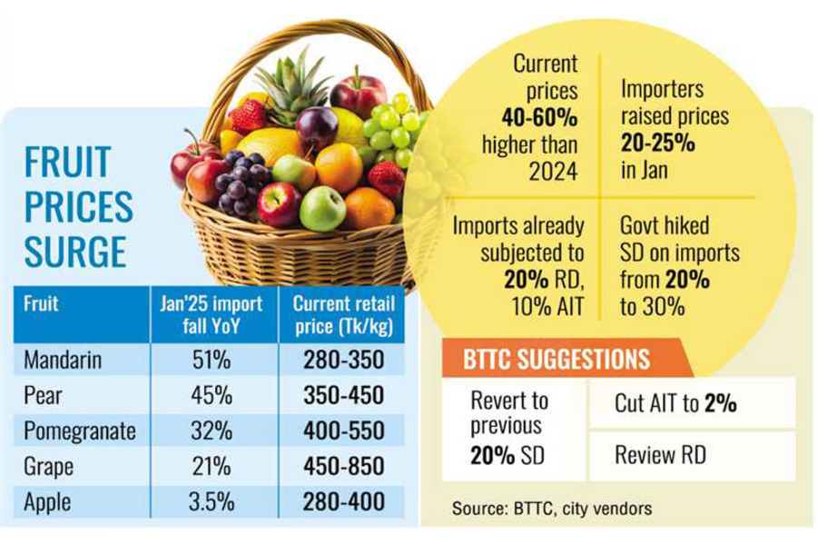 In response to the soaring prices, the Bangladesh Trade and Tariff Commission (BTTC) has recommended reducing import duties on fresh fruits, including apple, orange, grape, pear, and pineapple.