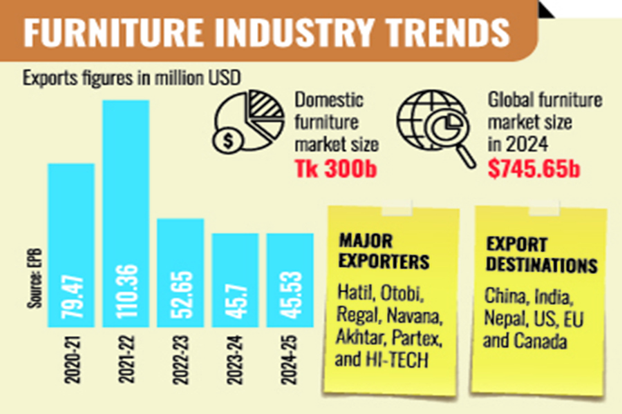 According to the latest data from the Export Promotion Bureau (EPB), furniture export earnings fell slightly by 0.37 per cent in the last fiscal year (FY 2024-25) to $45.53 million, down from $45.70 million in FY 2023-24.
