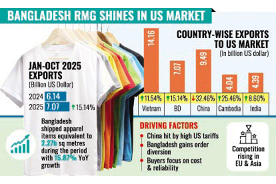 Bangladesh's apparel export to the United States, its single-largest market, has been on the ascent with a double-digit growth of 15.14 per cent recorded during the first ten months of 2025.