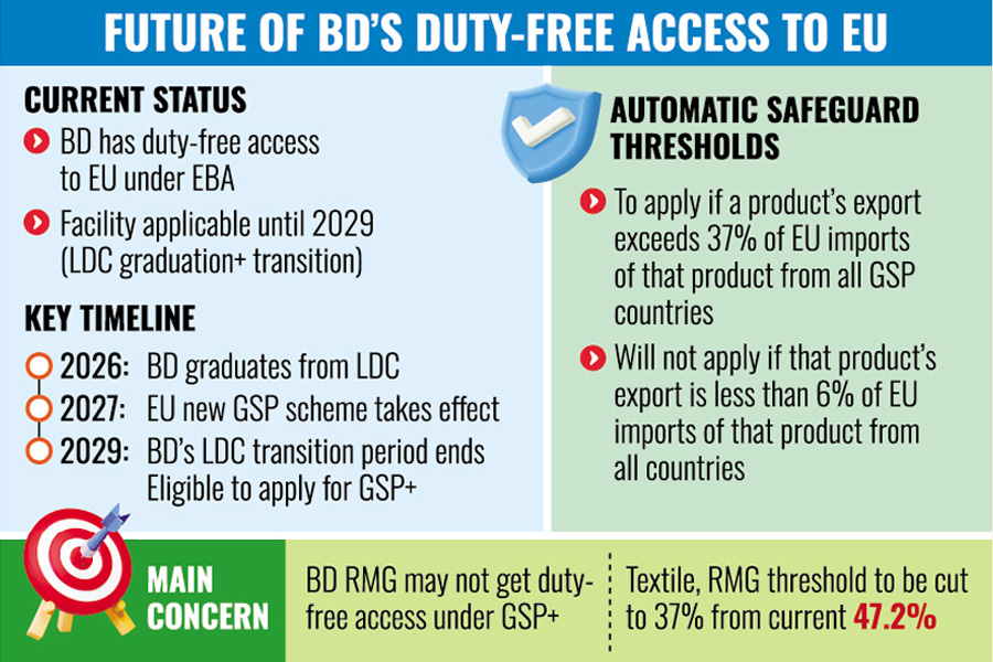 After the year 2029, Bangladesh will lose its duty-free market access to the EU under the current EBA or everything-but-arms facility and will eligible to apply for GSP-plus package deal, they say,