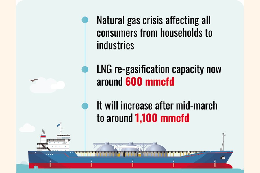 The country's natural gas output is currently hovering around 2,662 mmcfd, of which 607mmcfd is re-gasified imported LNG, according to Petrobangla statistics as on January 30.