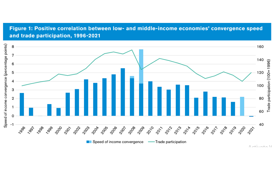 “From 1996 to 2021, a high trade share in GDP is significantly correlated to faster growth in low- and middle-income economies, converging to the level of GDP per capita in high-income economies,” says the report.