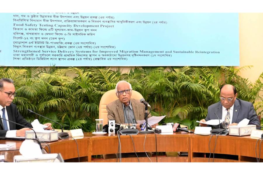 The other projects approved in the meeting are: Uttar Kattali Catchment Sanitation in Chattogram Metropolis with Tk 27.97 billion (Tk 2,797.22 crore), Improved seed production and development of rice, wheat and corn, 3rd phase with Tk 4.74 billion (Tk 474.68 crore), Modernization and development (2nd phase) of seed production, processing and distribution management of BADC with Tk 2.92 billion (Tk 292.86 crore), Food Safety Testing Capacity Development with Tk 24.09 billion (Tk 2,409.70 crore), Digging some four evaluation-cum-development wells of Titas and Kamta Fields with Tk 12.55 billion (Tk 1,255 crore), conducting 3-D Seismic Survey at Habiganj, Bakhrabad and Meghna Fields with Tk 4.54 billion (Tk 454.25 crore), Digging Sylhet-12 number well (oil well) with Tk 2.55 billion (Tk 255.25 crore), Ghorashal 4th unit re-powering, 3rd revised, with an additional cost of Tk 960.8 million (Tk 96.08 crore), Development of power distribution system of Chattogram Zone, 2nd phase, 2nd revised with an additional cost of Tk 1.64 billion (Tk 164.15 crore), Strengthened Service Delivery systems for Improved Migration Management and Sustainable Reintegration with Tk 601 million (Tk 60.10 crore), Establishment and infrastructural development of government primary schools at Dhaka metropolis and Purbachal, 1at revised, with an additional cost of Tk 2.13 billion (Tk 213.62 crore), and Establishment of digital labs at educational institutions, 2nd phase, 2nd revised with a reduced cost of Tk 88.6 million (Tk 8.86 crore).
