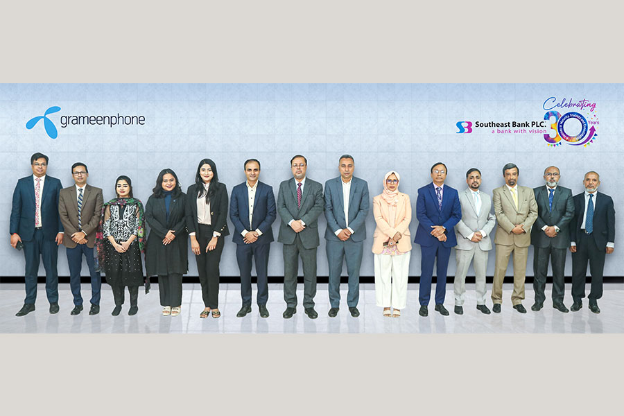 Mr. Abidur Rahman Chowdhury and Mr. Masum Uddin Khan, Deputy Managing Directors of Southeast Bank PLC and General Manager - Mr. Md. Shakhawat Hossain Khan, Key Account Manager - Ms. Moon Moon Nawshad, Strategic Account Manager - Ms. Ferdosi Ahmed and ICT Pre-Sales Expert - Ms. Salwa Islam Twinkle of Grameenphone Limited along with other senior officials from both organizations were also present in the meeting.