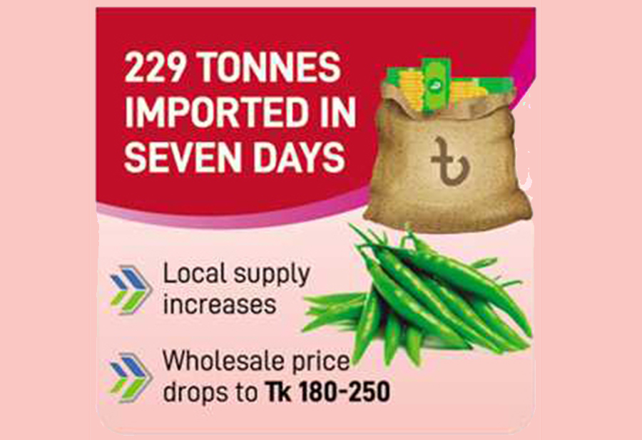 Meanwhile, private importers brought 229 tonnes of green chilli until 4:30 pm on Monday, said Muhammad Liakat Hossain Khan, deputy director of the plant quarantine wing (import) under agriculture ministry.