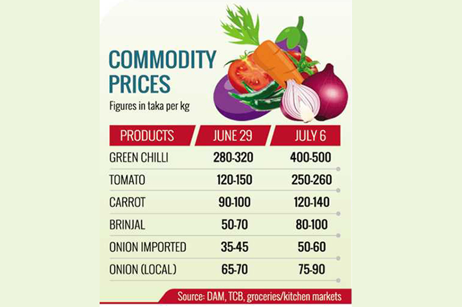 Prices then moderated to Tk 280-300 on July 3, only to rise again to Tk 400-500 per kg on July 4. As of July 6, the retail price in Dhaka city stood at Tk 400-550 per kg, according to kitchen market sources.