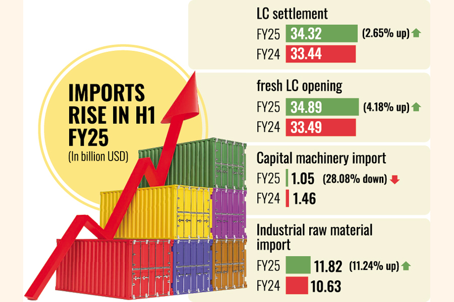 Actual imports in terms of LC settlements rose by 2.65 per cent to $34.32 billion during July-December of FY25 from $33.44 billion in the same period of the previous fiscal year, according to the central bank's latest statistics.