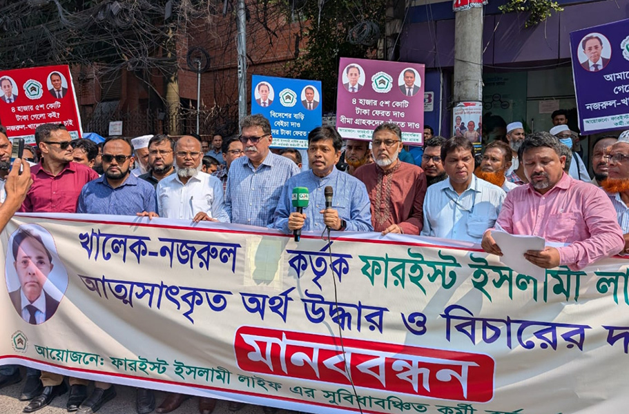 Officials, employees, and customers of Fareast Islami Life Insurance formed a human chain on Sunday, demanding the recovery of Tk 45 billion allegedly embezzled from the company and exemplary punishment for its former chairmen.