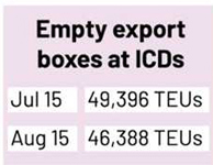 On 15 July, there were 49,396 TEUs of empty export boxes at the ICDs which fell to 46,388 TEUs on 15 August, according to BICDA statistics.