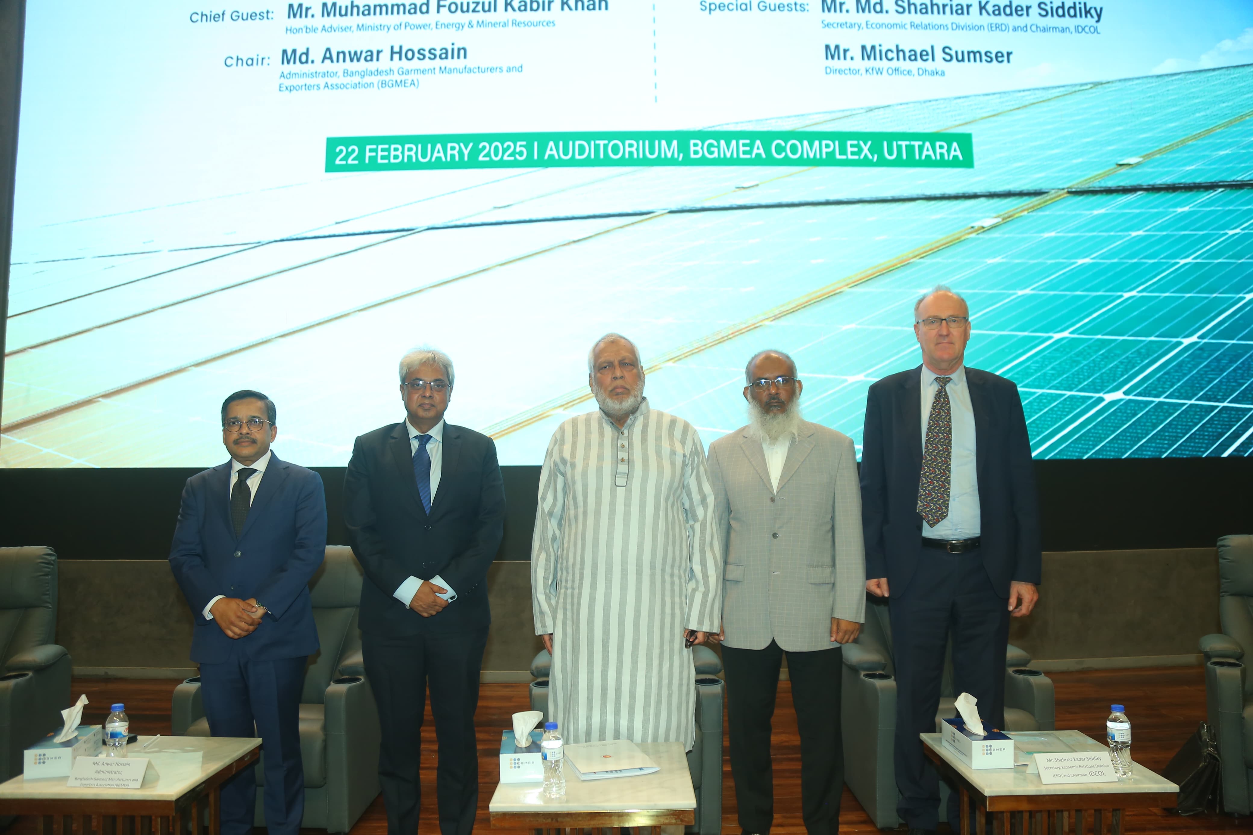 Dr. Muhammad Fouzul Kabir Khan, Adviser for the Ministry of Power, Energy & Mineral Resources; Ministry of Road, Transport and Bridges; and Ministry of Railways, Mr. Md. Shahriar Kader Siddiky, Secretary, Economic Relations Division (ERD) and Chairman, IDCOL; Mr. Michael Sumser, Director, KfW Office, Dhaka; and Mr. Md. Anwar Hossain, Administrator, BGMEA graced the occasion with their presence.