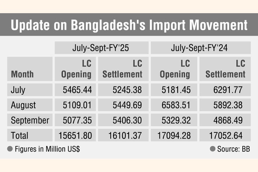 The actual import in terms of settlement of letters of credit (LCs) fell 5.58 per cent to US$ 16.10 billion during the July-September period of the fiscal year (FY) 2024-25, from $17.05 billion in the same period of the previous fiscal year, according to the central bank's provisional data.