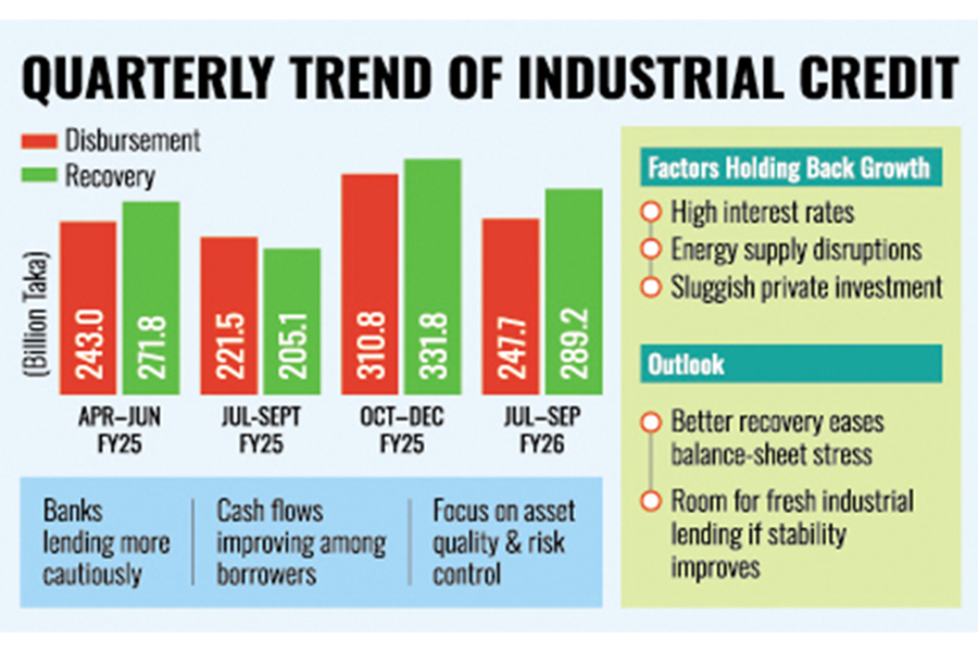 Disbursement of industrial loans stood at Tk 247.71 billion during the period, marking an 11.86 per cent increase from Tk 221.46 billion in the same period of the previous fiscal year. The latest figure also shows a 1.96 per cent quarter-on-quarter rise compared to Tk 242.96 billion disbursed in the April-June quarter of FY25, indicating a gradual pickup in industrial credit flow.