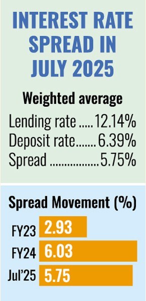 According to Bangladesh Bank data, the industry-wide spread stood at 6.03 per cent in FY2024, compared with just 2.93 per cent in FY2023.