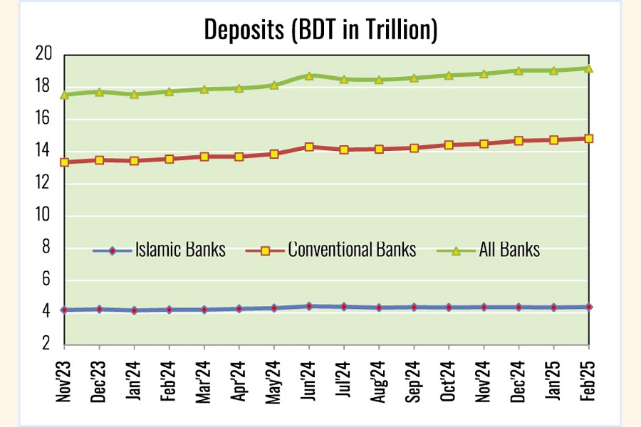 Islamic banks maintained consistent deposit growth, with figures increasing from Tk 4.19 trillion in February 2024 to Tk 4.36 trillion in February 2025 - a 4.0-percent rise.