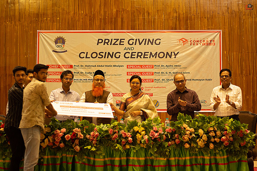 Six teams and three individuals were recognised for their outstanding performance, receiving awards and accolades from the Vice-Chancellor. Prof. Dr. Aysha Akter, Head of CUET's Civil Engineering Department; Prof. Dr. G M Sadiqul Islam, Faculty Advisor of ACI Student Chapter-CUET; Former Vice-Chancellor Prof. Dr. Jahangir Alam; and Fakhruddin Md. Khan of LafargeHolcim Bangladesh were present during the award-giving ceremony.