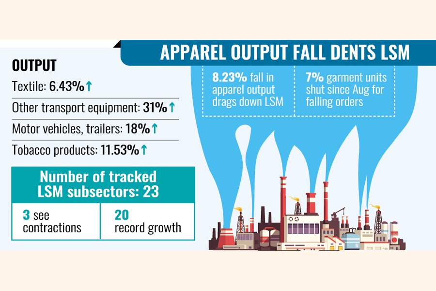 The large-scale manufacturing (LSM) sector contracted by 0.78 per cent in October year on year due to a sharp slowdown in the garment industry, according to the latest Bangladesh Bureau of Statistics (BBS) data. LSM, which accounts for about 11 per cent of the gross domestic product (GDP), was dragged down by an 8.23 per cent year-on-year fall in apparel output.