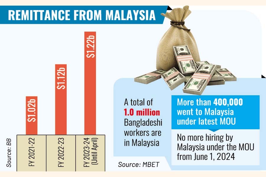 Currently, more than 1.0 million Bangladeshi nationals, mostly unskilled labourers, reside in Malaysia. Their money transfers to home steadily increased from $1.02 billion in FY 2021-22 to $1.12 billion in FY 2022-23 and reaching $1.22 billion by April this year.