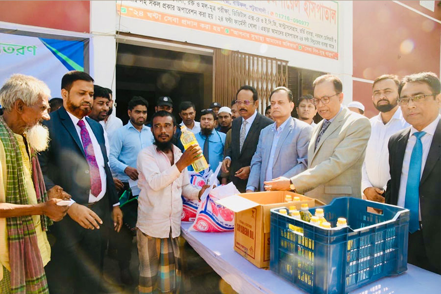 A S M Feroz Alan, Sponsor Director of Mercantile Bank PLC distributed food items to 900 poor families at Kalaiya in Baufal, Patuakhali on Friday (8 November 2024) at Shaheda Gafur Ibrahim General Hospital premises.
