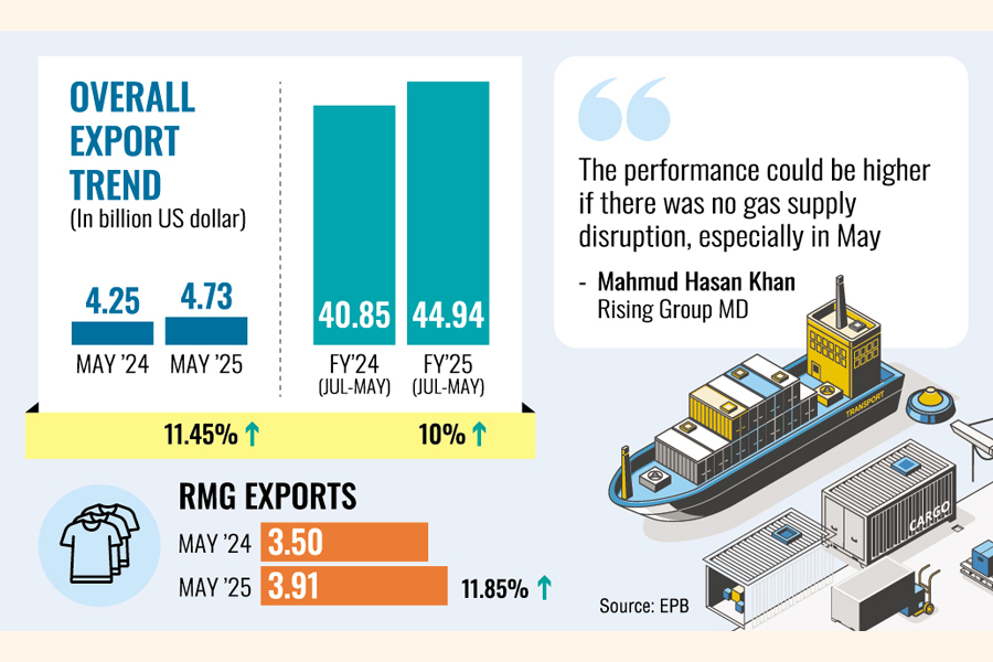 The country's single-month merchandise-export earnings in May 2025 witnessed a double-digit growth of 11.45 per cent year on year to fetch US$4.73 billion due to the sustained performance of ready-made garment industry.