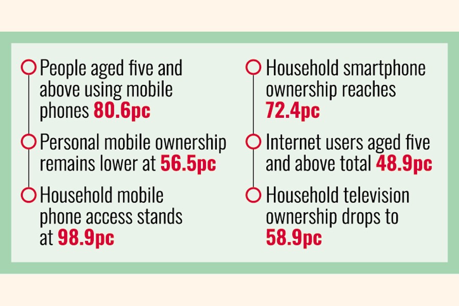 Mobile phone and internet access in Bangladesh continued to expand during the July-September quarter of 2025, reflecting steady progress in digital connectivity, although gaps persist in personal device ownership, internet use, gender parity, computer access and the urban-rural divide, according to the latest survey by the Bangladesh Bureau of Statistics (BBS).