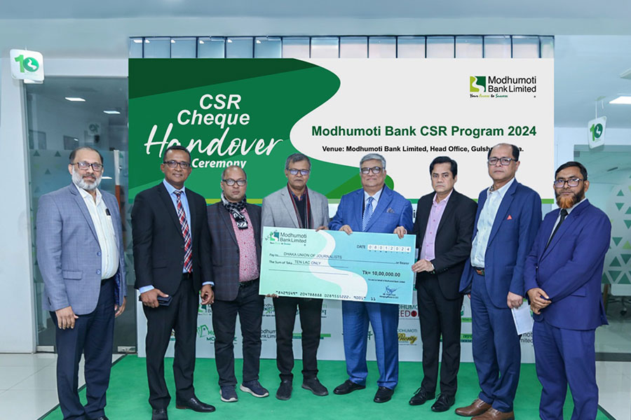 Md Shafiul Azam, Managing Director and CEO of Modhumoti Bank Limited handed over the cheque to Sohel Haider Chowdhury, President of Dhaka Union of Journalists at the bank’s head office in Gulshan, Dhaka on Wednesday, according to a press release.