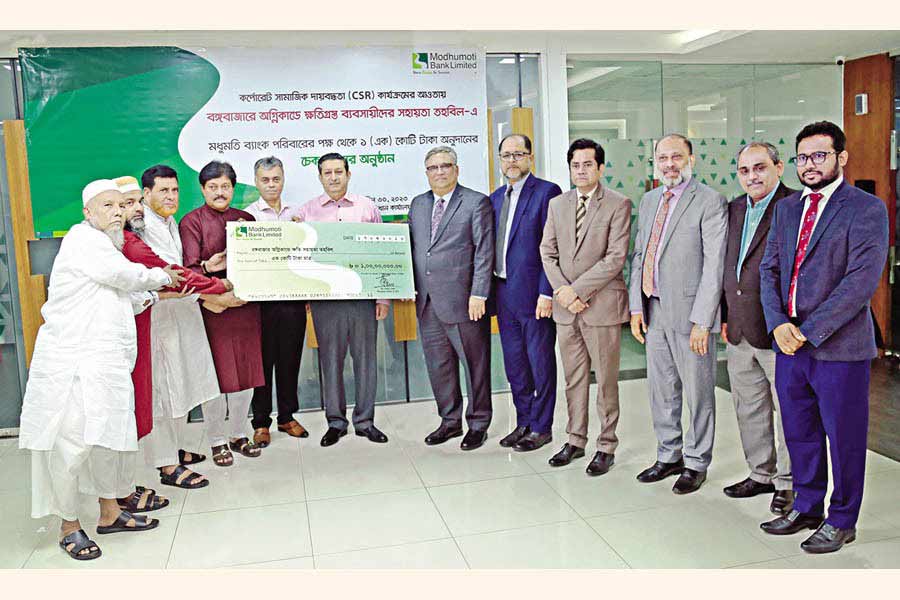 As part of its CSR programme, Modhumoti Bank Limited donated Tk 10 million for the rehabilitation of the fire-affected traders of Bangabazar Clothing Market, according to a press release.