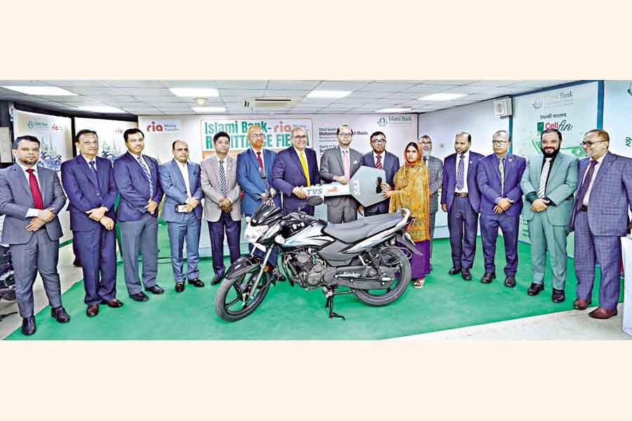 Managing Director and CEO of Islami Bank Bangladesh Bank (IBBL) Mohammed Monirul Moula hands over a motorcycle to a winner of Islami Bank-Ria Money Transfer Cash Remittance Festival at a ceremony at the Islami Bank Tower in Dhaka on Tuesday.