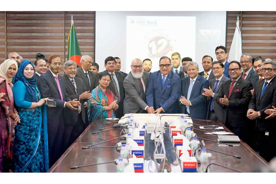 Mr. Iqbal Ahmed OBE DBA, Chairman of NRB Bank PLC along with Mr. Tarek Reaz Khan, Managing Director & CEO, Mr. A K M Mizanur Rahman FCA, Chairman, Audit Committee, Mr. Shaikh Md. Salim, Chairman, Chairman, Risk Management Committee, Independent Directors Ferdous Ara Begum & Mr. SK. Matiur & Professor Sharif Nurul Ahkam is seen cutting cake to celebrate the Bank’s 12th Anniversary in a function held at Bank’s Corporate Head Office, Dhaka.